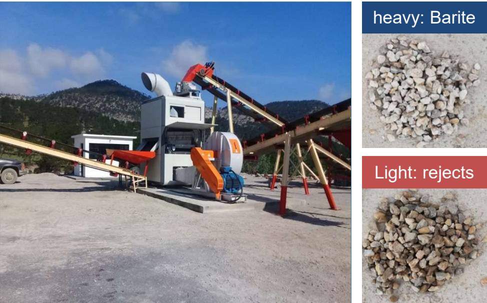 进料 出料 (轻料:剔除 / 重料:重晶石矿) 结果 2019年初改造阶段 ● 开始GSort (G19) 现场试验一台设备,试验成功后,业主马上决定购买GSort ● 业主现在可以分选3 – 25 mm 的尾矿,并为其他企业进行尾矿加工 ● 仅用69天就收回了投资成本 2019年下半年改造阶段 ● 根据前期的试验结果,业主马上增购了GSort (G19)分选机和MSizer筛分机 ● 将矿石的粒度分成4个级别通过使用MSizer筛分机以便达到更高的分选精度 ● 帮助其他企业进行尾矿加工 最先进的解决方案,最好的技术体验 ● 和湿式分选方法相比,有更好的产品质量,尤其在选别尾矿时更为突出 ● 工艺设计紧凑,占地面积小,因此项目更容易实施 ● 和湿式分选方法相比,投资费用非常的低,因此投资成本回收快,正如墨西哥的项目分析所证明的 ● 使用Gsort分选机为主导的干法分选,运行费用也非常低 ● Gsort分选机对进料的适应范围广,能根据进料(如粒度)进行调整,可以加工第三方的尾料 ● 阿盖尔就可以提供整套的设备: 输送机, 筛分机 (MSizer), 分选机(Gsort), 过滤器和控制系统